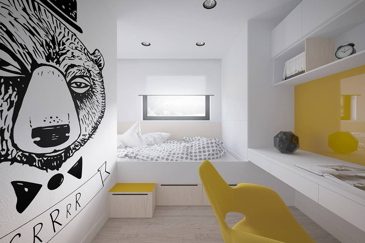 Лаконичный интерьер детской комнаты для подростков-интровертов и любителей свободного пространства. В интерьере нет ничего лишнего, в цветовой гамме преобладают спокойные тона. Для стиля характерно минимальное количество элементов декора, каждый предмет имеет свое назначение