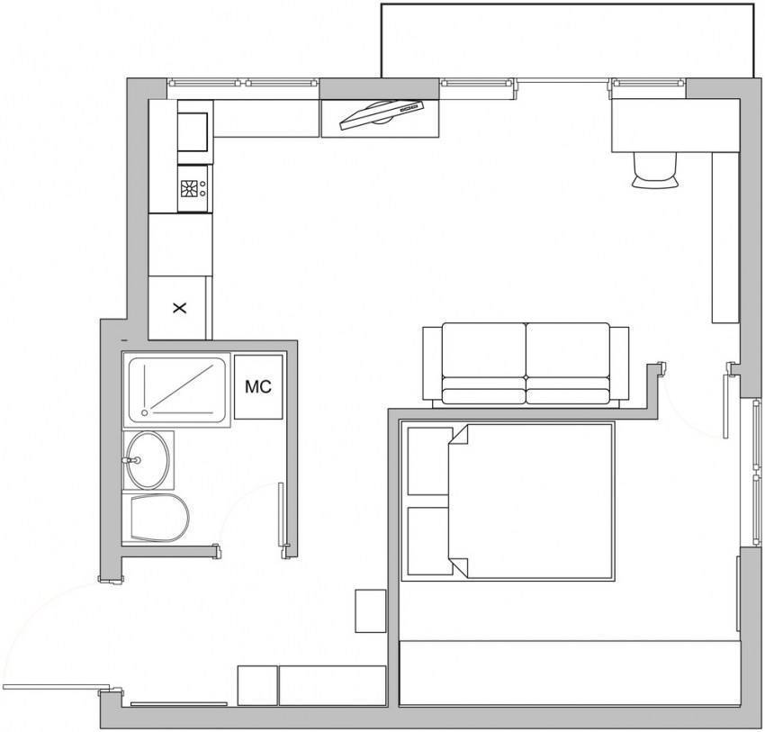 Отсутствие внутренней перегородки позволяет без труда установить стиральную машину, дополнительный предмет мебели или сантехнический прибор.