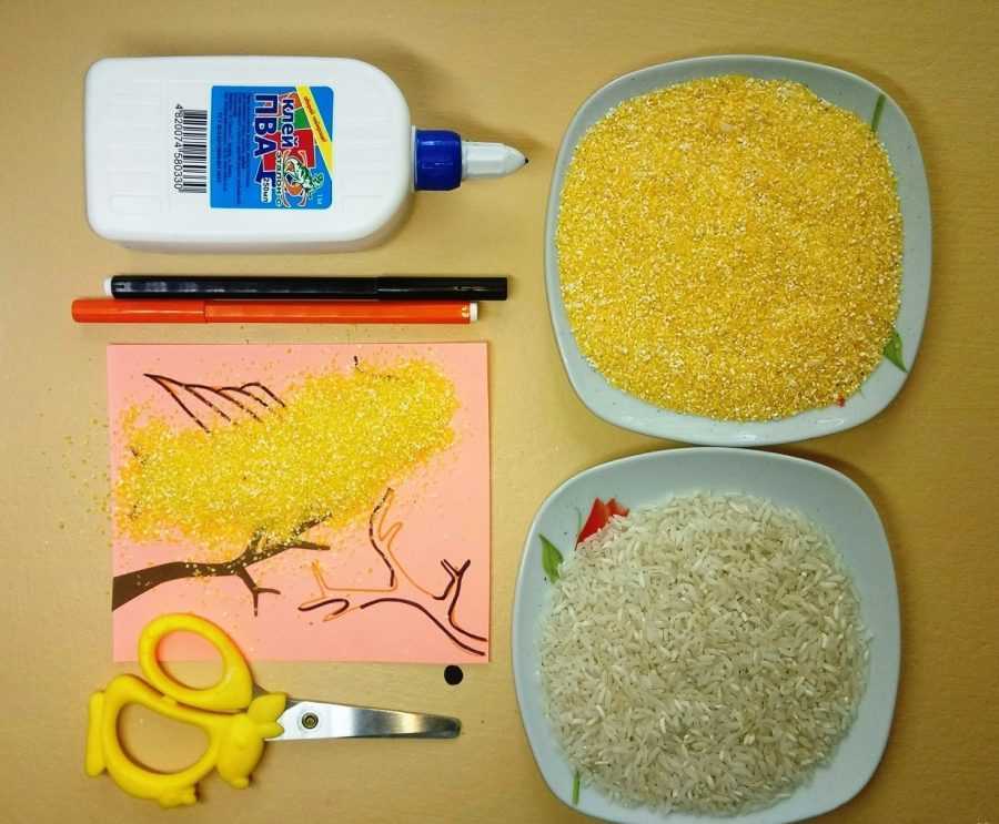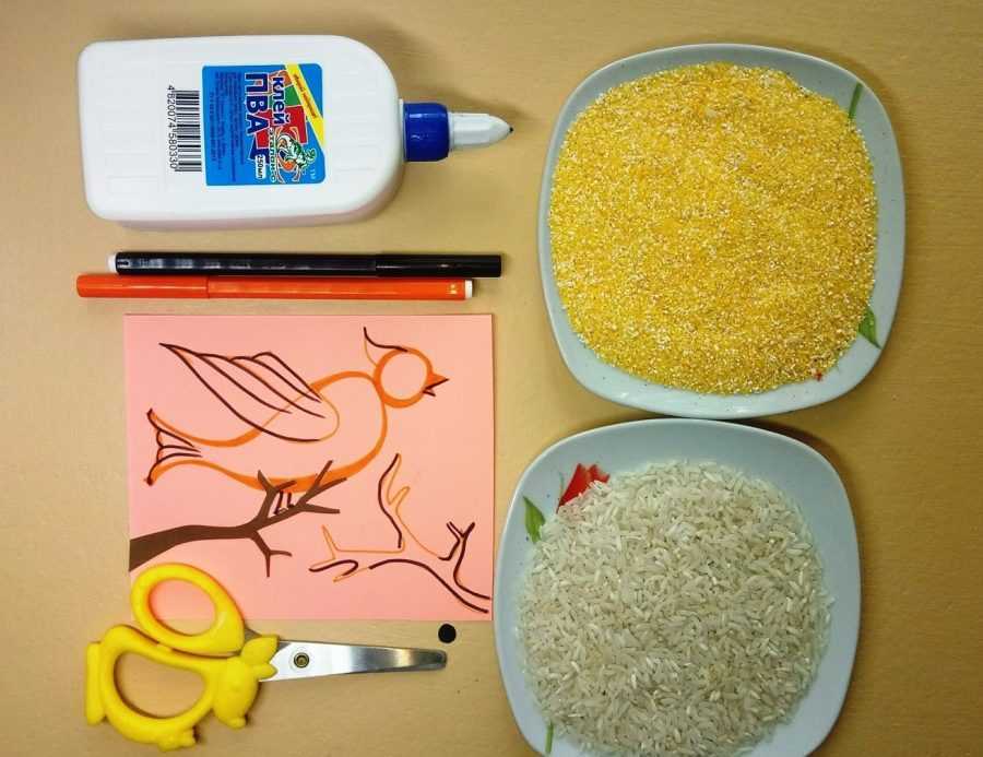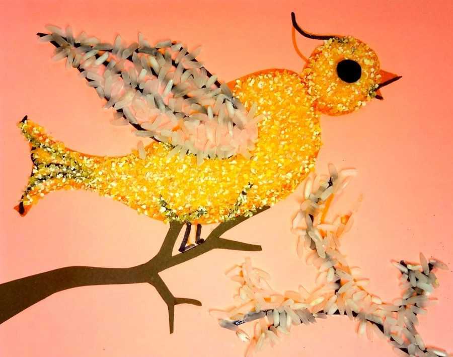 На листке плотной цветной бумаги (лучше картона) рисуем контуры. Покрываем их слоем клея ПВА. Там, где шея, бока, крылья, насыпаем и выравниваем по линии контура зернышки риса. Между зернами риса на крупных деталях помещаем несколько более крупных семян кабачка.