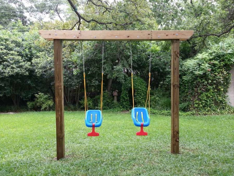 Для размещения качелей важно выбрать открытое место, на котором ребенок не ударится при раскачивании. Конструкция вкапывается в землю на глубину 0,8-1 м, в ямы засыпают щебень и бетонируют.