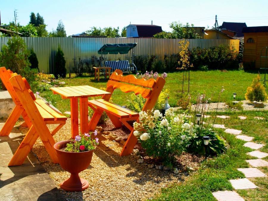 - Самостоятельное обустройство места для отдыха, предполагает её близкое расположение возле дома, на подготовленном заранее основании, в небольшой полутени.