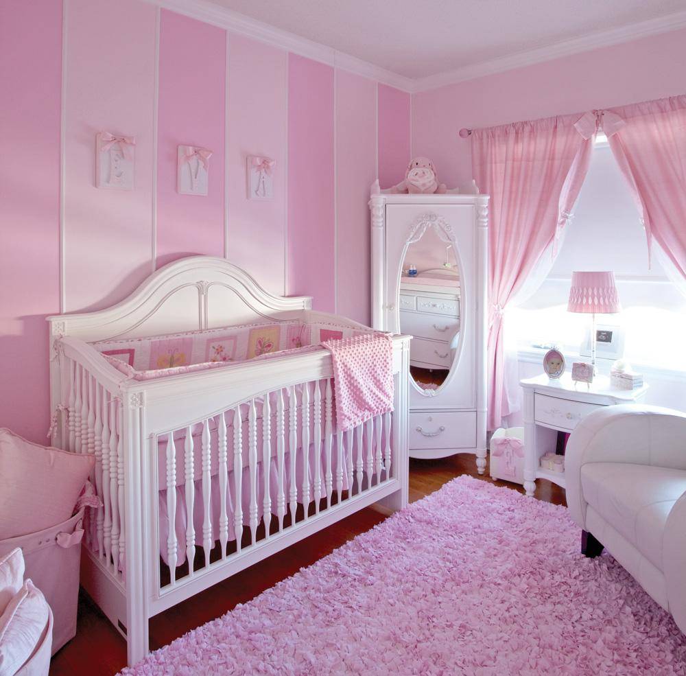 На фото кроватка белого цвета, декорированная розовым балдахином в интерьере детской для новорожденной девочки.