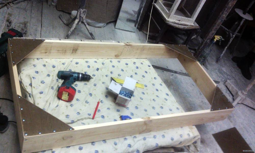 4. Далее необходимо прикрутить ножки. Здесь используются прямоугольные дощечки, которые соответствуют дизайну кровати.