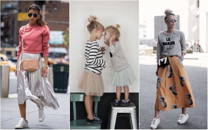 Если вы молодая и прогрессивная мама, то просто обязаны примерить модную юбку в сочетании со свитшотом. И не забудьте прихватить такой же комплект для дочки. Ведь после торжественной линейки непременно нужно отметить начало нового учебного года.