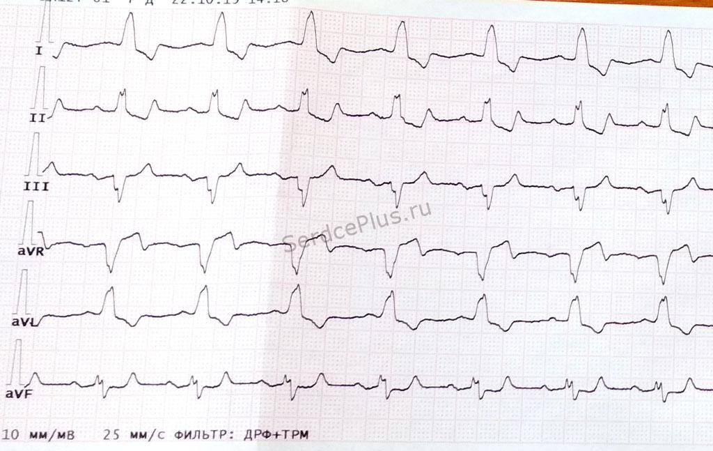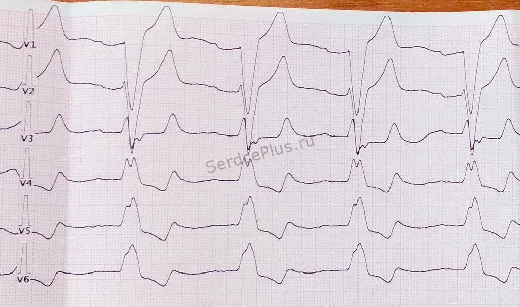 Q I, V6, RIII или rIII, rV1, в V1 часто регистрируется зазубрина — комплекс имеет вид rSR’. ЭОС отклонена вправо. Широкий S в I, V6, высокий и широкий R’ в V1. Желудочковый комплекс имеет вид qRS с широким S в отведениях I, aVL, V6, возможно и в V4,V5 и форму rSR’ или rR’ в отведениях V1, III, реже в V2 и aVF. QRS расширен до 0,12 и более.