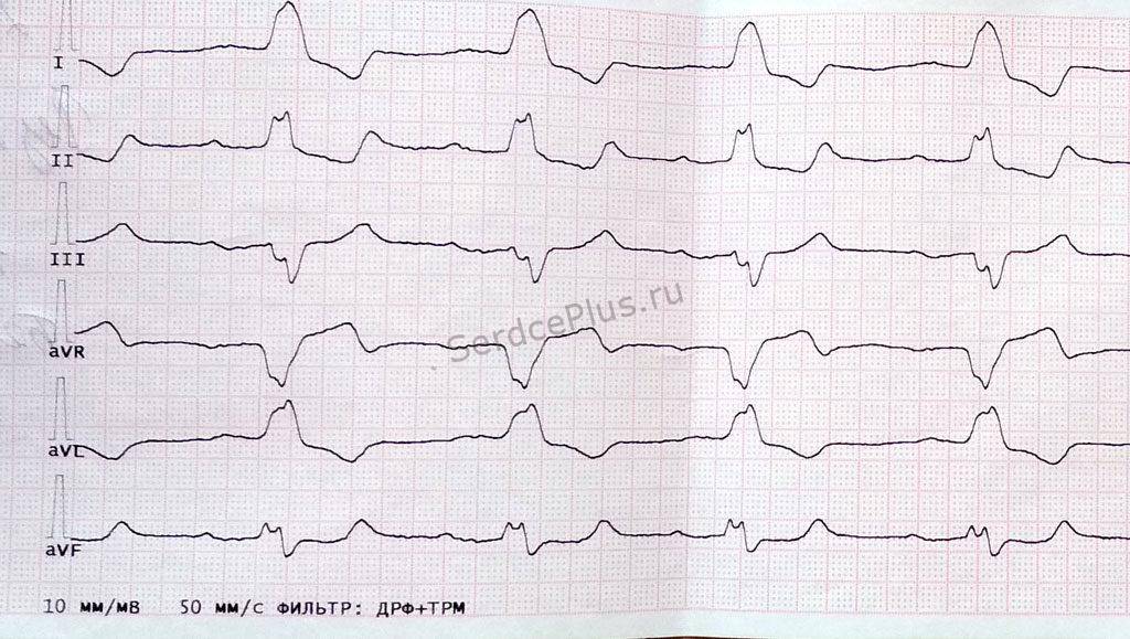 Рис. 3. Блокада левой ножки пучка Гиса и АВ-блокада 1 степени.