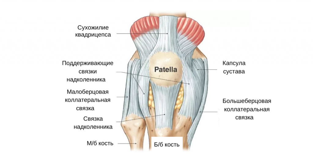Каждая связка обеспечивает поддержку и защиту коленного сустава, также эти связки косвенно усиливают друг друга. Существует две связки, которые больше всего связаны с пателлофеморальным суставом, — это две коллатеральные связки (латеральная и медиальная), потому что они сливаются с капсулой колена. Надмыщелково-пателлярные и мениско-пателлярные связки образуют медиальную и латеральную ретинакулярно-надколенниковую часть связочного комплекса, обеспечивающего медиальное и латеральное прикрепление сухожилия квадрицепса на уровне надколенника.