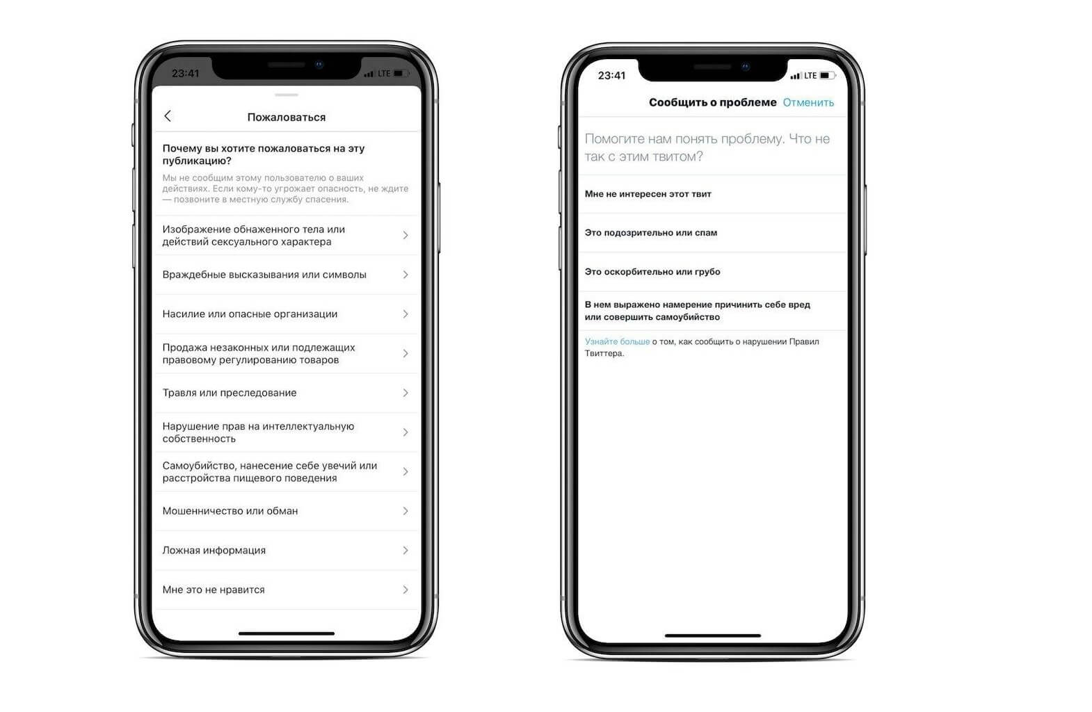 Примеры окон для жалоб на контент в Твиттере и Инстаграме