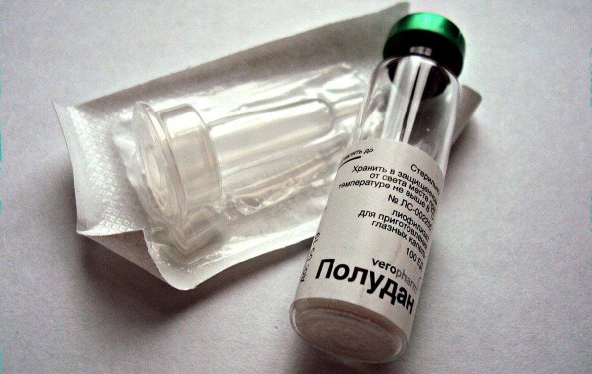 «Полудан» — капли, индуцирующие синтез интерферона, что значительно ускоряет процесс выздоровления. Действующие компоненты — полиадениловая кислота, полиуридиловая кислота. Рекомендована инстилляция в глаза по 1-2 капли несколько раз в сутки. Улучшение состояния заметно уже на третий день применения капель.