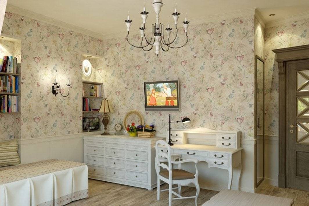 В детской сочетает классику и деревенский прованс, отличается потертостью мебели или эффектом реставрации. Цвета подбираются пастельные, для мальчика – бежевый, серый, голубой, зеленый, а для девочки – пастельно-фиолетовый, светло-желтый, розовый оттенок, рюши, оборки и банты, балдахин.
