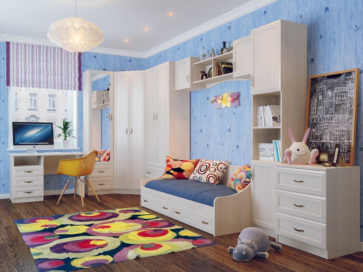Светлая цветовая палитра (пастельные обои с рисунком или без, глянцевый белый потолок, не использовать более трех цветов для создания интерьера). Уместны яркие акценты для детей до 7 лет и более приглушенные после 9 лет.