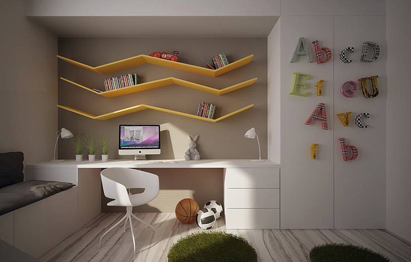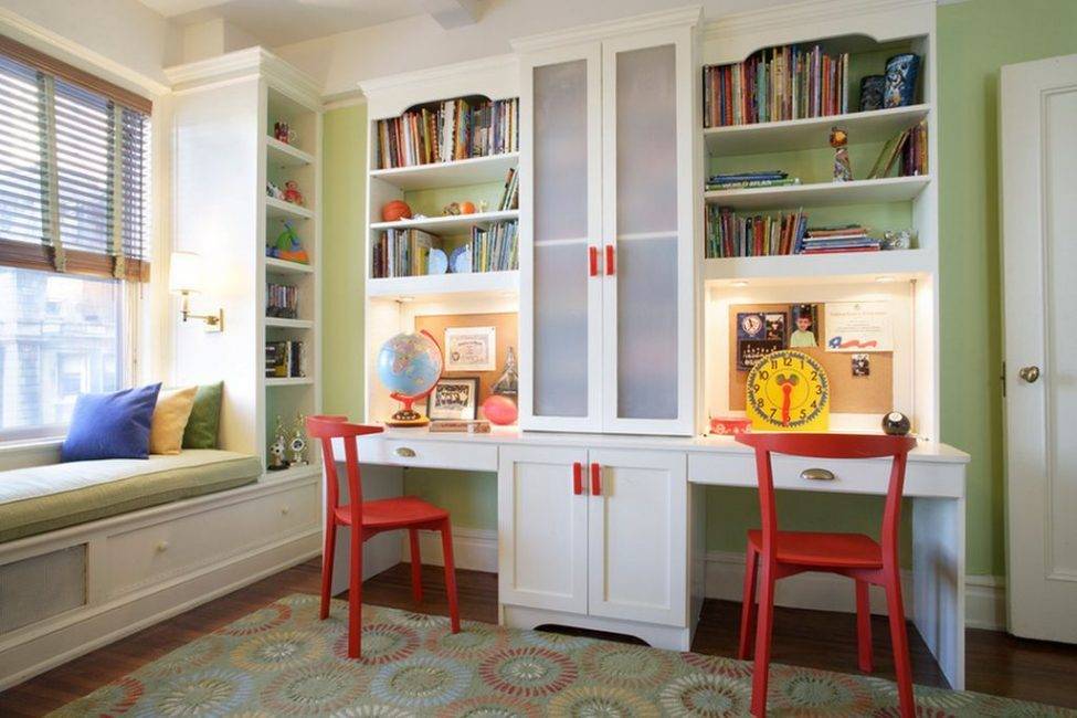 Что касается рабочей зоны, то у каждого ребенка должен быть свой отдельный письменный стол, на котором он самостоятельно расставит школьные принадлежности. Желательно, чтобы учебные зоны располагались подальше друг от друга, чтобы детям удобно было учить уроки.