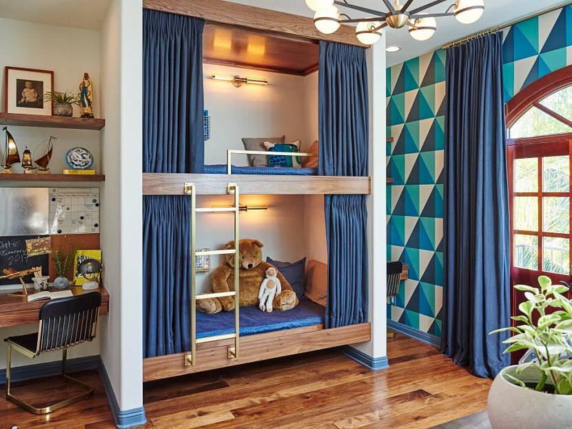 Что касается дизайна детской, то здесь применяется общая стилистика. Для дошкольников выбираются сказочные мотивы: кровати могут быть сделаны в форме кораблей, паровозов, машин. На одну из стен можно наклеить фотообои с любимыми мультипликационными героями. Дизайн интерьера выбирается в зависимости от темперамента и увлечений мальчишек. Но чаще всего дизайнеры рекомендуют выбирать следующие стили и темы оформления: хай-тек, кантри, лофт, классический, морской, скандинавский, современный.