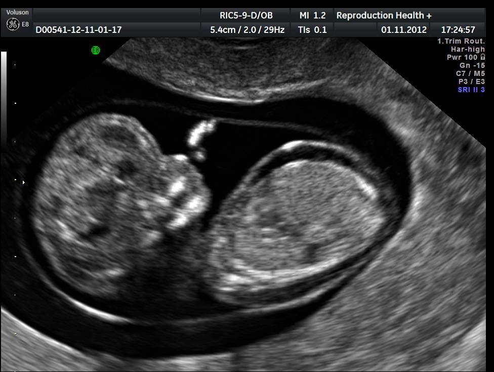На 12 неделе эмбриональный период оканчивается, перетекая в плодный. Можно визуализировать внутренние органы, костные структуры, прослушать сердцебиение, узнать половую принадлежность. В это время у ребёнка активно формируются лицевые кости, уши, глазницы, подбородок, зачатки молочных зубов, поэтому на УЗИ (ультразвуковом исследовании) их можно чётко рассмотреть.