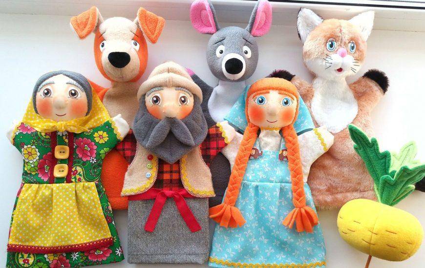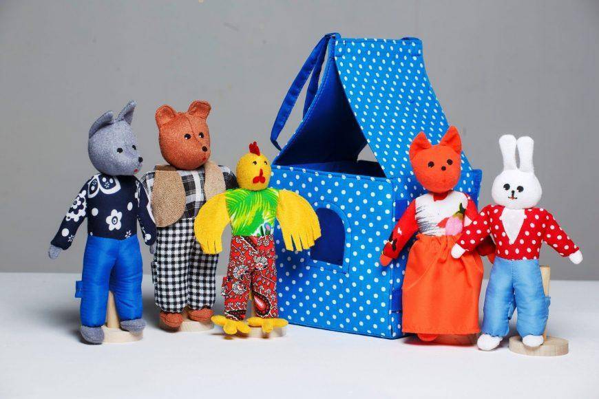 Для сюжета очень удобно выбрать известные русские сказки «Теремок», «Колобок», «Маша и Медведь». В них главные герои-животные. Кукол-животных для кукольного театра своими руками сделать действительно просто: в интернете без труда можно отыскать большое количество выкроек, как простых, так и сложных. Или в качестве кукол-животных можно использовать мягкие игрушки-лисичку, зайца, медведя.