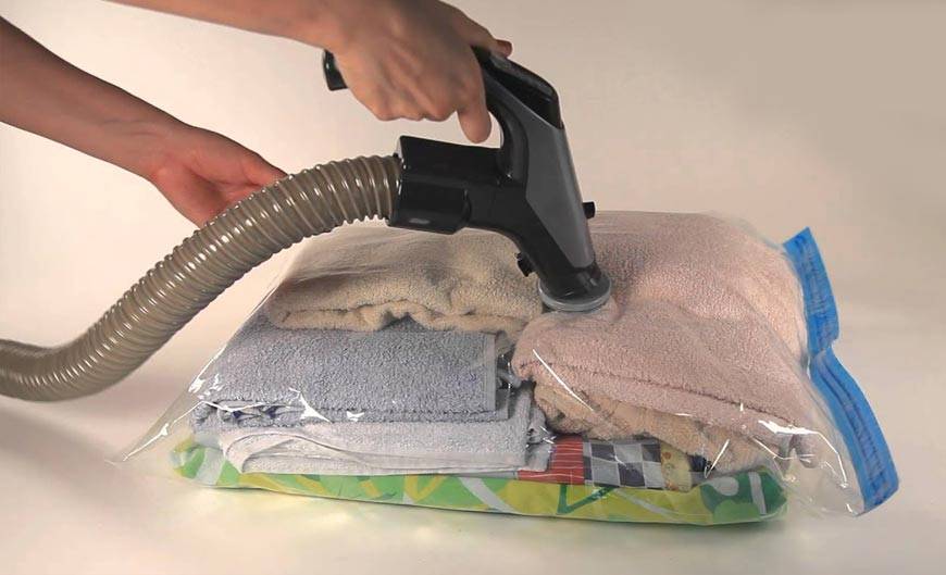 Отличный вариант высвободить место – воспользоваться вакуумными пакетами. Их несложно найти в продаже, они бывают всевозможных размеров. После откачки воздуха содержимое становится практически плоским.