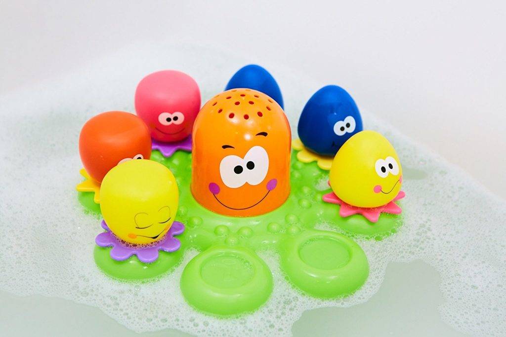Аксессуар для игр представлен в виде осьминожки. Предназначен для детей от 1 года. Смысл заключается в наполнении игрушки водой и весёлого поливания. Мелкие детали способны прикрепляться к стенкам и брызгать, при предварительном погружении в воду.