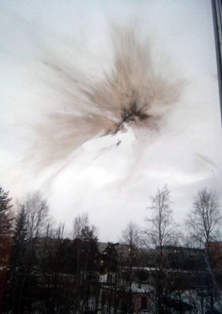 Разбитые стеклопакеты после попадания в них сигнальной ракеты