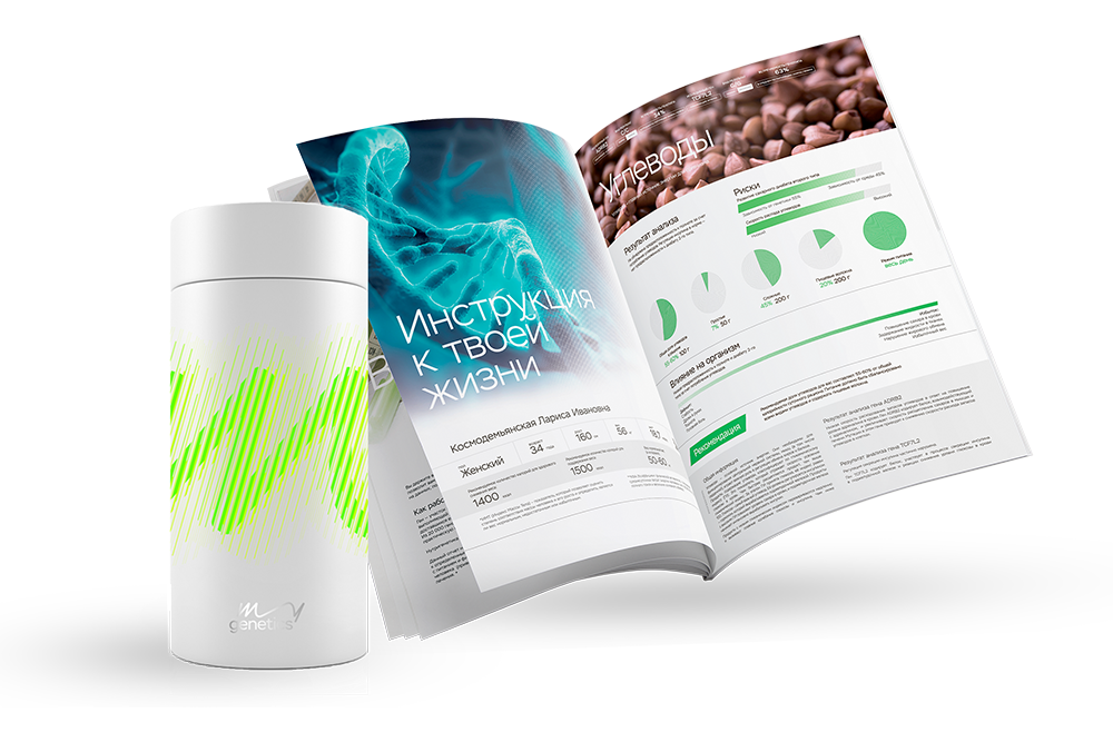 В зависимости от целей исследования в MyGenetics изучают от 8 до 34 генов. Затем диетологи и нутрициологи центра составляют детальный ДНК-отчёт — от 31 до 62 страниц, в зависимости от выбранного вида исследования.