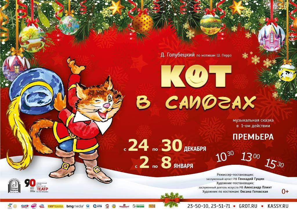 Русский драмтеатр представит музыкальную сказку в одном действии, где герои будут петь, танцевать и играть с детьми. Ребята из зрителей превратятся в участников события и вместе с добрым сказочником сочинят волшебную и поучительную сказку о «Коте в сапогах».