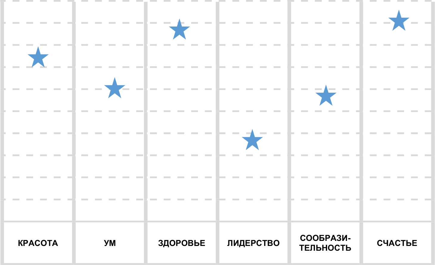В конце хотелось бы поделиться лайфхаком для родителей, как проверить самооценку ребенка самостоятельно. Начертите на листе бумаги вертикальные графы со значениями от 0 до 10, отметьте середину. Это могут быть красота, ум, здоровье, лидерство, сообразительность и обязательно — счастье. Попросите вашего ребенка отметить себя, как он думает, на этих шкалах, сказав, что внизу находятся самые-самые-самые глупые дети (на примере шкалы ума), а наверху — самые умные в мире дети, просто гении.