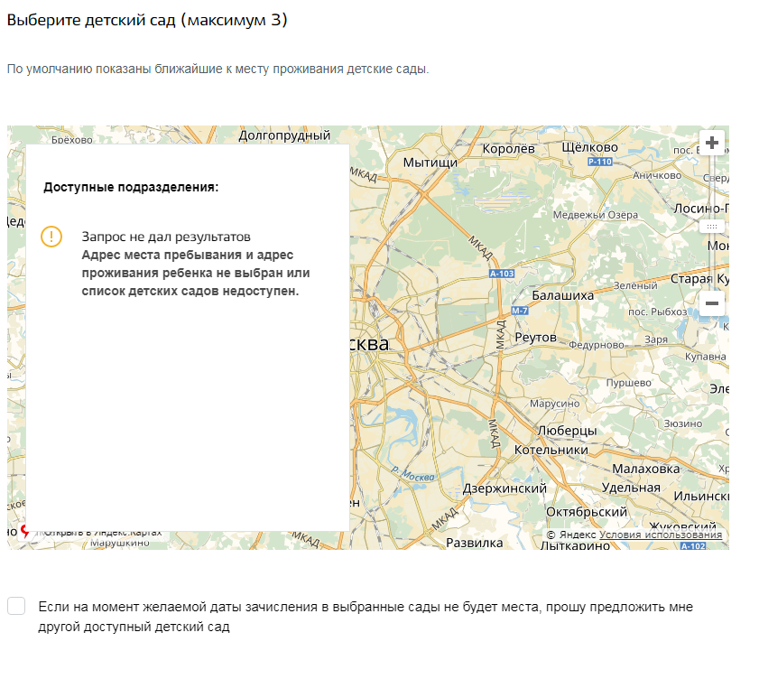 - отметьте галочкой специальный чек-бокс, если желаете получить путевку всё равно, пусть и в другом саду, если в выбранных вами на момент подачи заявки мест не окажется;