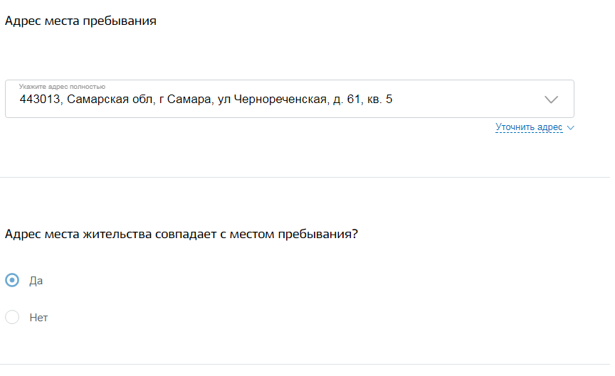 Следующим пунктом прописывается адрес регистрации крохи (место прописки). Далее нужно уточнить, совпадает ли адрес прописки с местом проживания или нет.