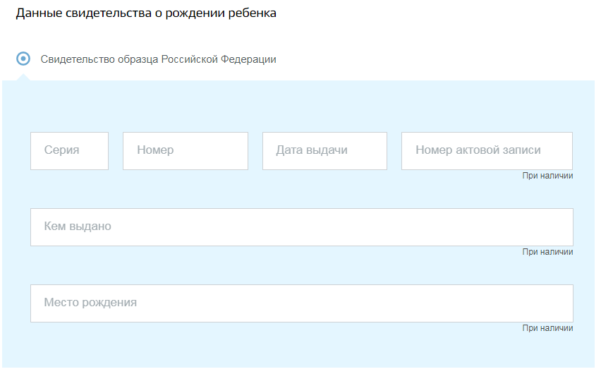 - заполните все данные на ребенка, включая сведения из его свидетельства о рождении;