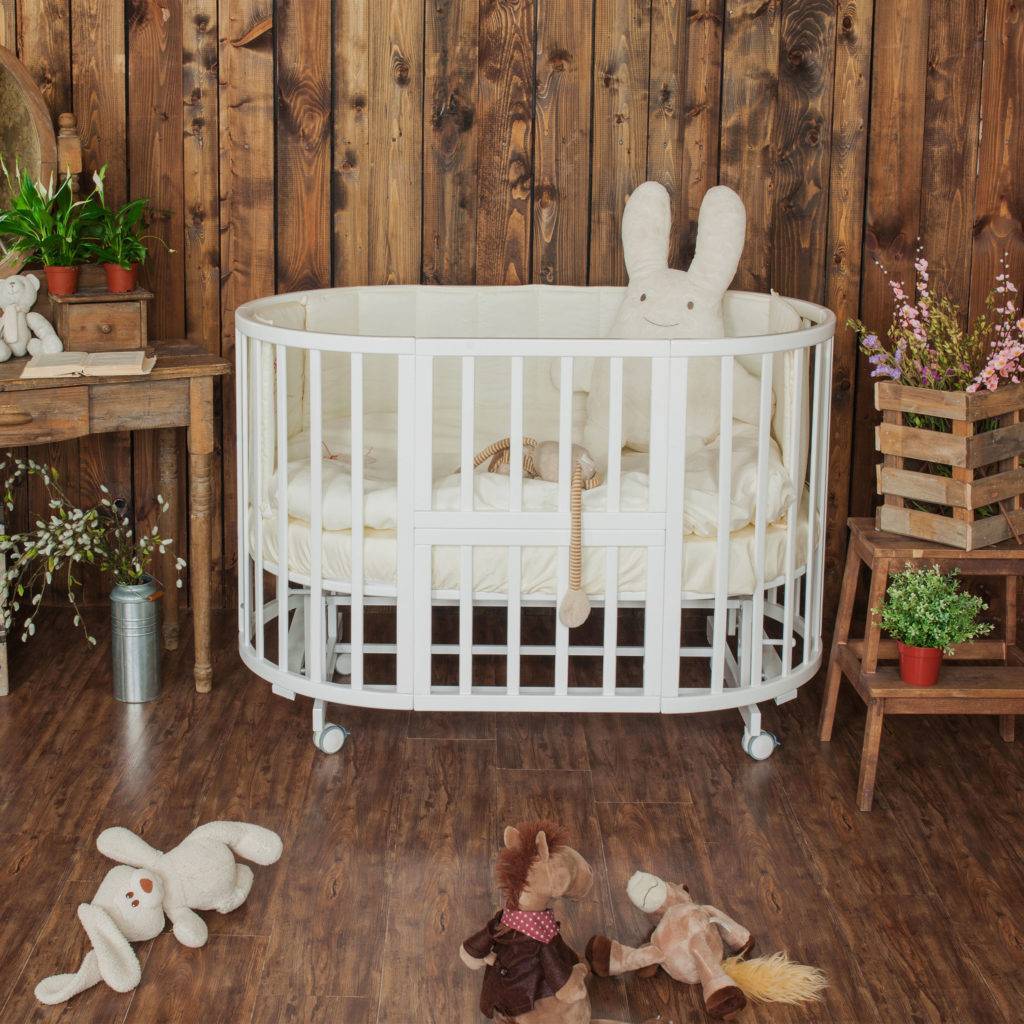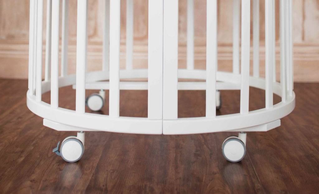 Качественная круглая кровать для новорожденных отличается прочной и устойчивой конструкцией, в которой каждая деталь выполняет конкретную функцию. Дополнительно устанавливается многоступенчатая система регулирования высоты основания, колесики и расширение для преобразования колыбельки в полноценную овальную детскую кроватку.