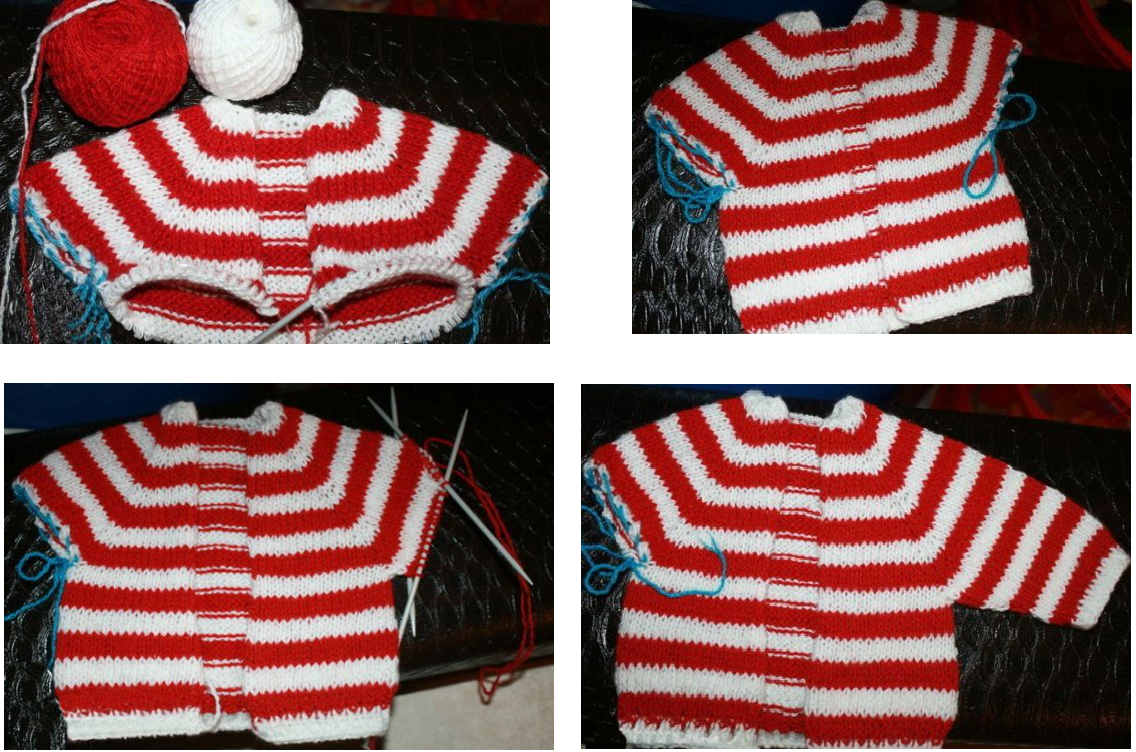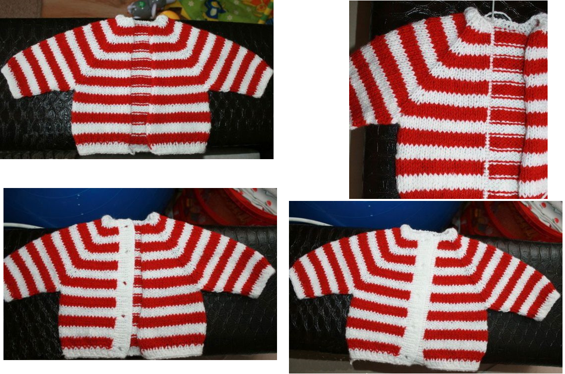 - Продолжаем вязать, делая в лицевых рядах прибавки по одной петле до и после регланов. Таким способом нужно вязать до тех пор, пока получившаяся верхняя часть изделия не будет доходить до линии подмышек ребенка (можно измерить по любой кофточке или по ребенку).