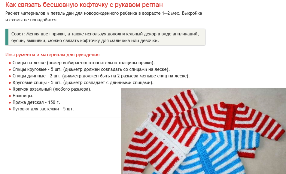 Попробуем связать кофточку с рукавом-регланом. Такое изделие вяжется без швов, что очень удобно и комфортно для маленького ребенка.