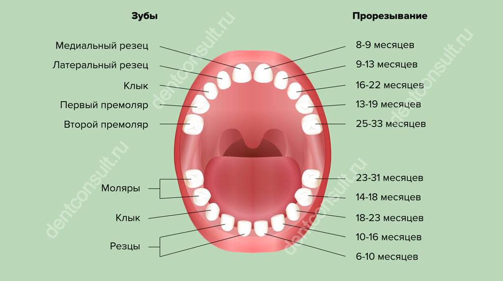 Сколько зубов и какие появляются на каждом отдельном этапе развития ребенка? Чтобы ответить на этот вопрос, рассмотрим условную схему данного процесса: