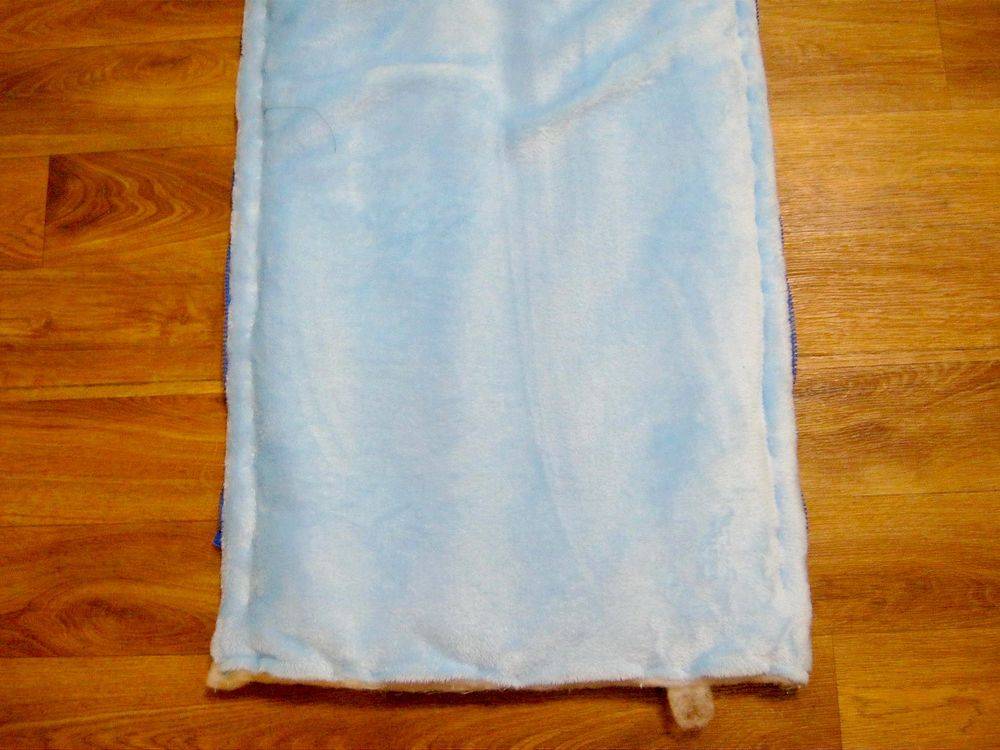 - одеяло-трансформер готово. Остался самый интересный момент – придать трансформеру нужную форму. Для этого следует положить одеяло карманом вниз, соединить большую молнию на одеяле, застегнув ее на половину длины. Затем вывернуть наружу карман, находящийся с нижней стороны трансформера, так, чтобы он наполовину прикрыл молнию (это будет место для ножек). Поместить малыша в полученный конвертик и застегнуть молнию до конца. При помощи короткой молнии-застежки сверху сформировать колпак для головки малыша.