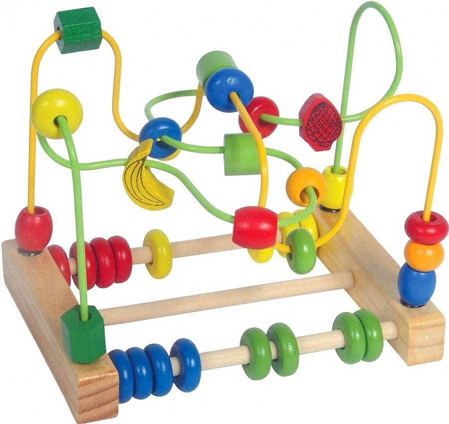Игрушка сделана в сочных ярких цветах. На лабиринте прикреплены фрукты, бусины, квадраты и другие геометрические фигуры. Ребенок передвигает их по спиралям, запоминая последовательность. Это способствует осознанию причинно-следственных связей и развитию логического мышления. На нижних перекладинах располагаются разноцветные счеты. С их помощью можно научить ребенка считать.