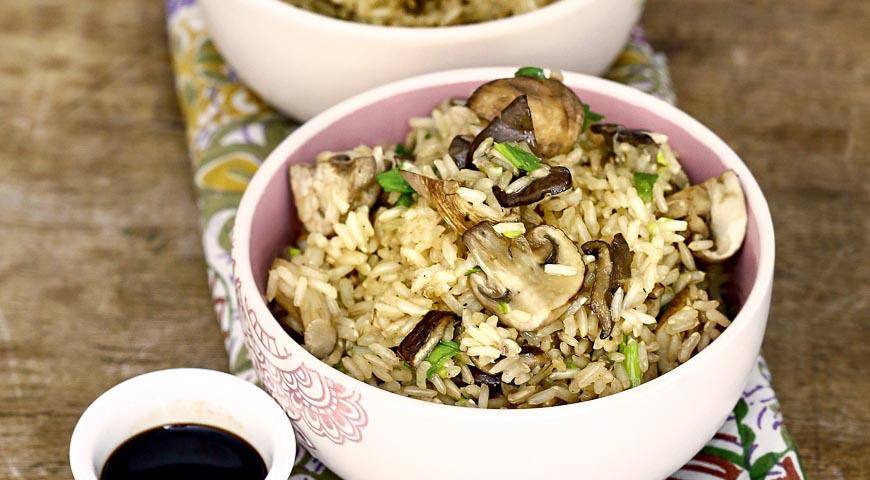 1 луковицу и 1 морковь очистить, мелко нарезать, припустить на растительном масле. Добавить 350 г шампиньонов, тушить 10 минут. Посолить, засыпать в эту же посуду 200 г риса и два раза больше воды. Дать блюду закипеть, затем укрыть крышкой и тушить до готовности риса.