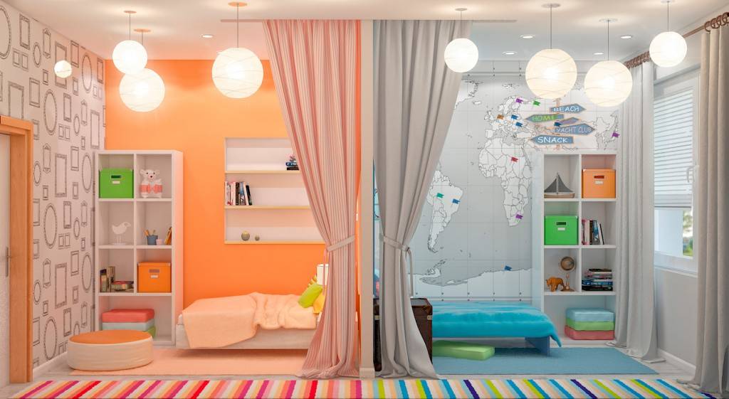 - Используйте разное текстильное оформления для мальчиков и девочек: постельное белье, наволочки на диванные подушки и т. д. Шторы на окнах при этом должны быть нейтральных, универсальных цветов.