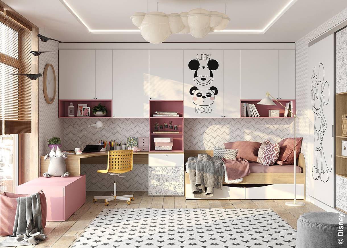 Детская Mr.Doors в тематике «Микки Маус и его друзья» хорошо подойдет «на вырост» для юных принцесс. Сначала в светлой комнате с Микки будет стоять кроватка для малыша, затем подростковая кровать. Цвета спокойные, розовые акценты можно уравновесить серыми элементами текстиля, деталями интерьера. И 3-летняя девочка, и 12-летний подросток будут в восторге от такой стильной комнаты.
