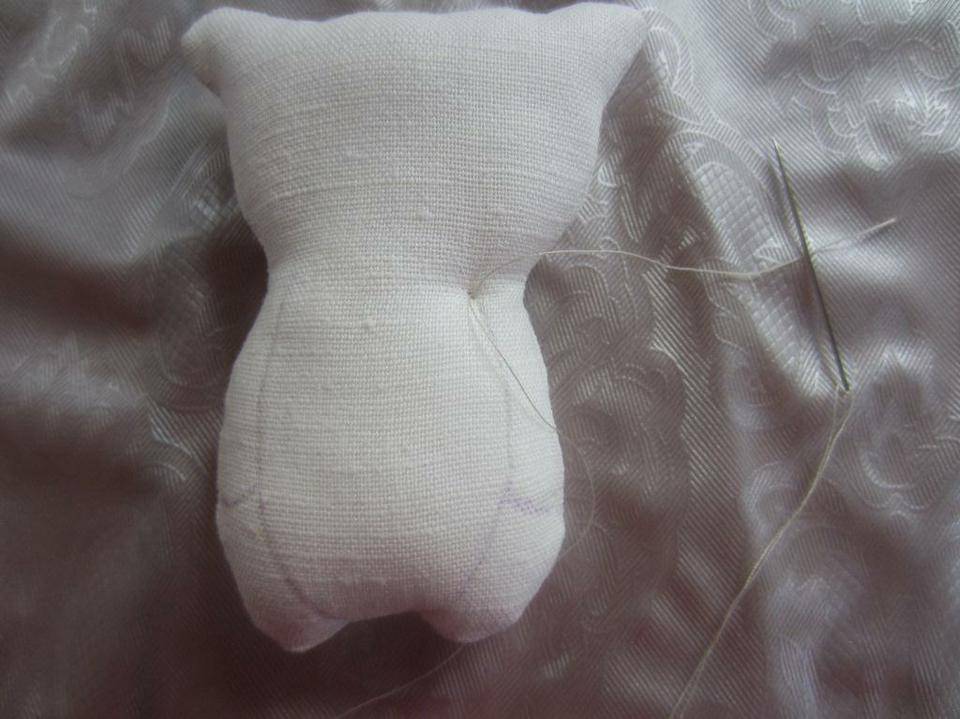 Плотно набиваем игрушку, уделяя особенное внимание ушкам и лапкам так, чтобы холофайбер был распределен по фигурке равномерно. Зашиваем отверстие потайным швом