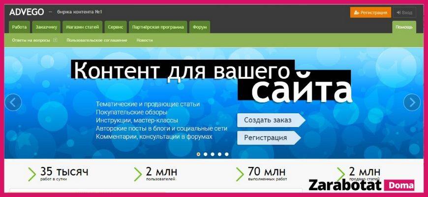 Адвего – одна из бирж копирайтинга. Расчет производится в долларах США. Зарабатывают здесь на написании текстов под заказ, продаже собственных статей, оставлении отзывов и даже на лайках в соцсетях.