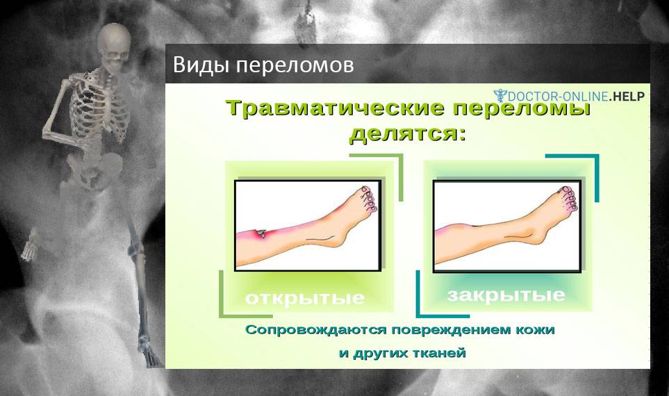 В зависимости от расположения отломков переломы кости бывают открытыми и закрытыми. В первом случае травма сопровождается повреждением мягких тканей, вплоть до того, что кость оказывается видимой. При закрытом переломе такого не случается: мягкие ткани остаются целыми, кровоизлияний нет.