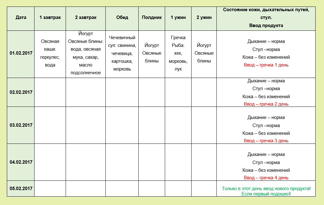 - Если у ребенка обнаружились высыпания или он стал нервным и капризным, то от употребления нового блюда лучше отказаться. Для удобства наблюдения и систематизации информации следует вести дневник питания.