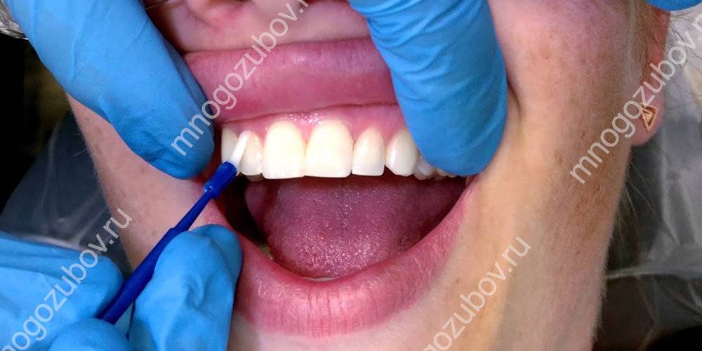 Второй нюанс – средство густое, а наносить его для достижения положительного эффекта и в целях безопасности нужно тонким слоем и равномерно, не касаясь при этом десен, языка и слизистой. Провернуть все это в домашних условиях довольно сложно: всегда есть риск переборщить с дозировкой, а также травмировать или обжечь слизистую.