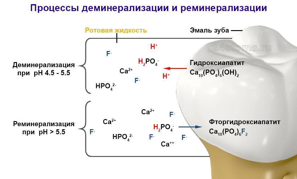 В частности, критическим значением кислотного pH, при котором гидроксиапатит зубной эмали начинает растворяться – является значение 5,5. В свою очередь для фторгидроксиапатита – критическим значением pH является значение 4,5, т.е. он начинает растворяться при намного большей концентрации кислоты в полости рта. Таким образом, эмаль зубов благодаря ионам фтора оказывается не только прочнее, но и устойчивее к воздействию кариесогенных бактерий, что снижает риск развития кариеса.