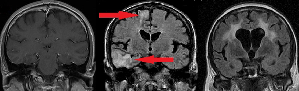МР-томография головного мозга. Мозг выглядит серым, цереброспинальная жидкость – черной, пострадавшие участки мозга – белыми.