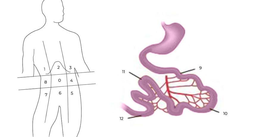 Чтобы его рассчитать, брюшную полость и тонкую кишку условно делят на 13 областей-квадрантов, в каждом из них оценивают самый крупный опухолевый очаг по шкале от 0 до 3: