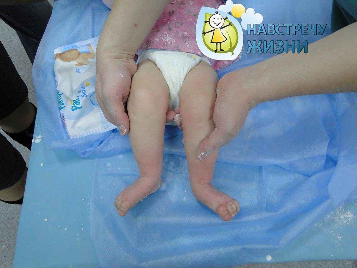 Если кожные покровы младенца плохо переносят гипсовое покрытие, допустимо на срок в 7 – 10 дней переводить ребенка в гипсовый лонгет, назначать ванночки, смазывать поверхность кожи нежирным кремом до восстановления ее нормального вида. Далее вновь необходимо продолжить этапное гипсование.