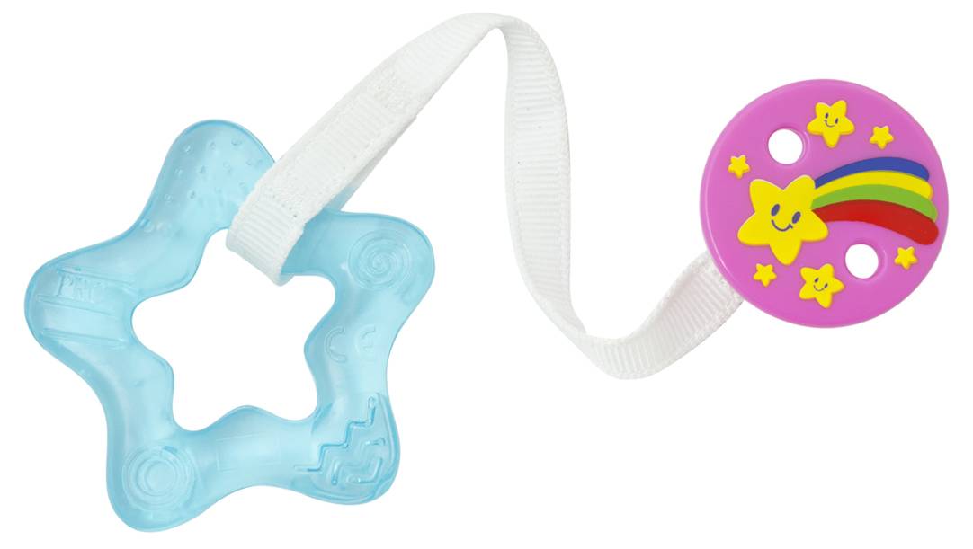 Отлично подойдет товар от компании «Мир детства» в форме звезды. Он прикрепляется лентой и держится прищепкой на одежде или коляске. Такая конструкция очень удобна, потому что не позволяет детям ронять ее на пол, а затем тянуть в рот. Внутри – вода, что увеличивает эластичность. Продукт рекомендуют покупать уже с 4 месяцев.
