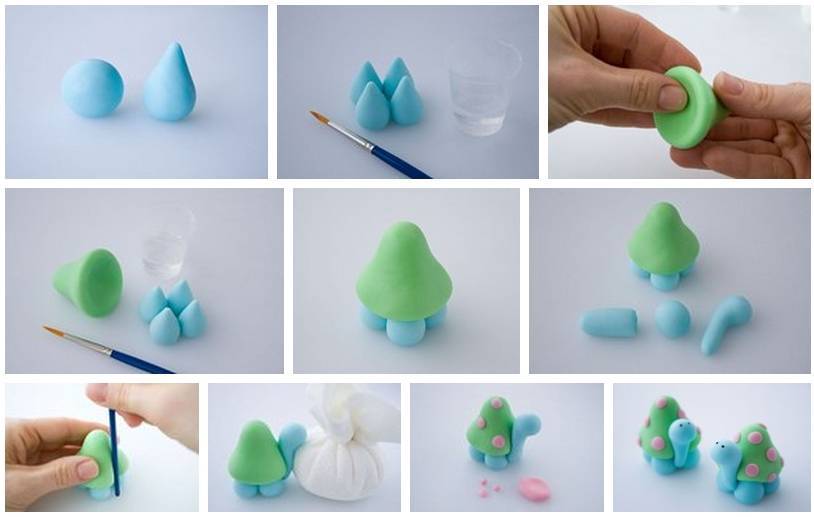 Необходимо сделать пять капелек: четыре устойчивых, поменьше и одну большую, с небольшой вмятиной внутри. Четыре капельки соединяются и накрываются большой. Это — ноги и панцирь черепахи. Чуть вдавливаем с одной стороны панцирь и делаем длинную шею с круглой головой. Делаем глазки и рисунок на “домике” — готово.