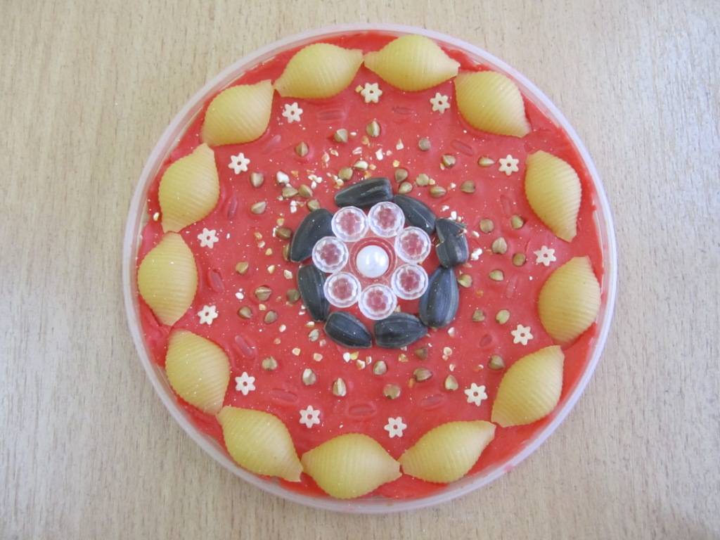 пицца – лепим шарик, расплющиваем его и, придавливая, раскладываем макароны-звездочки, рис, гречку и любые «продукты»;