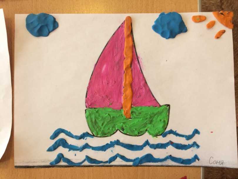 Лепка в садике детям 2-3 года должна состоять из крупных элементов. Игрушечный транспорт будет хорошим вариантом для творческого процесса. Для парусника нужны три массы разного цвета: